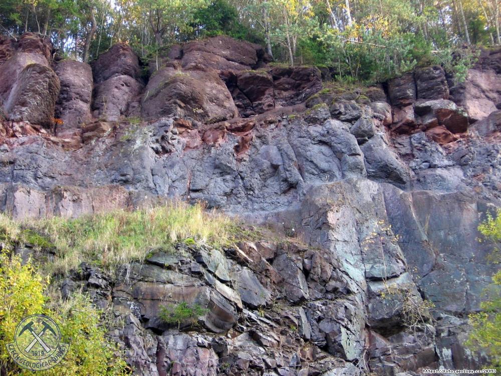 Stěna lomu Hvězda s polohou melafyrů ve spodní části snímku a polohami zvrstvených hrubozrnných pyroklastik v nadloží. Kontakt lávového proudu s polohou pyroklastik. | Stárková, Marcela | 2007